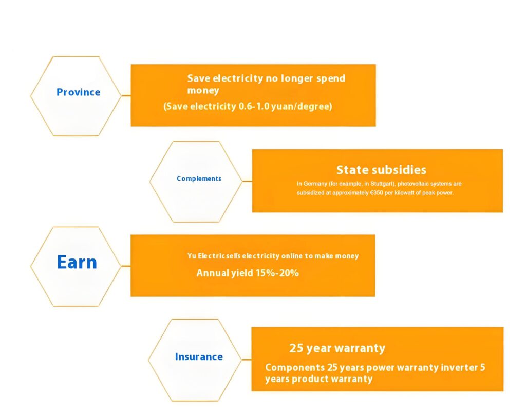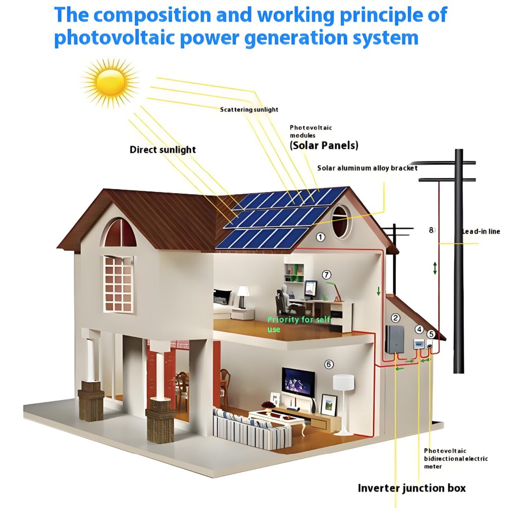 • Junction box: collect the electricity generated by solar panels and transmit it to the inverter with built-in protective electrical components, which can suck Received abnormal voltage generated by lightning.