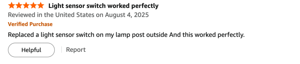La fotocellula che controlla la luce da pesca del mio pontile si è rotta una settimana fa e ho ordinato questa confezione da due da Amazon (1 per l'installazione e 1 di riserva). Questa fotocellula è un ricambio identico a quella che ho acquistato in ferramenta qualche anno fa. Il cablaggio di questa fotocellula è in rame stagnato, che offre una protezione superiore contro la corrosione nel mio ambiente di acqua salata. Il cablaggio è stato semplice e, dopo averlo collegato, l'ho collegata alla corrente per vedere se la luce si accendeva. Quando ho acceso la fotocellula, la luce si è accesa brevemente finché i condensatori al suo interno non si sono caricati e, una volta caricati, la luce si è spenta come previsto. Nel complesso sono molto soddisfatto di questa fotocellula, credo che abbia un buon rapporto qualità-prezzo e la ordinerò di nuovo se necessario.